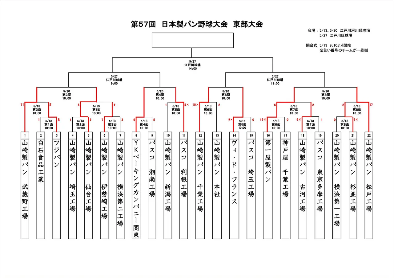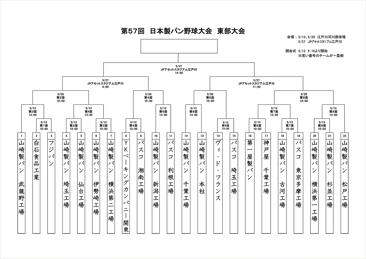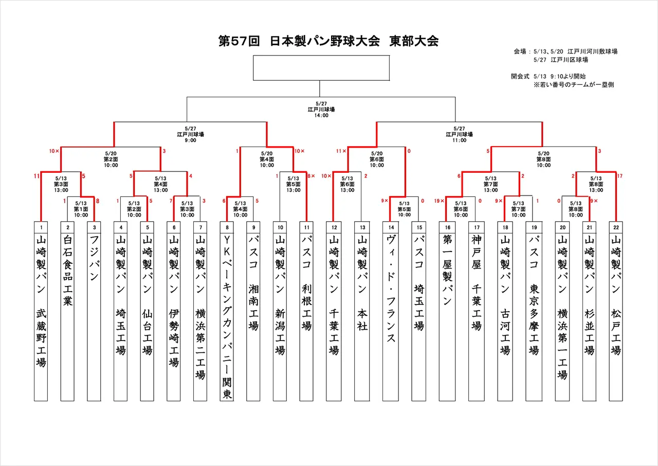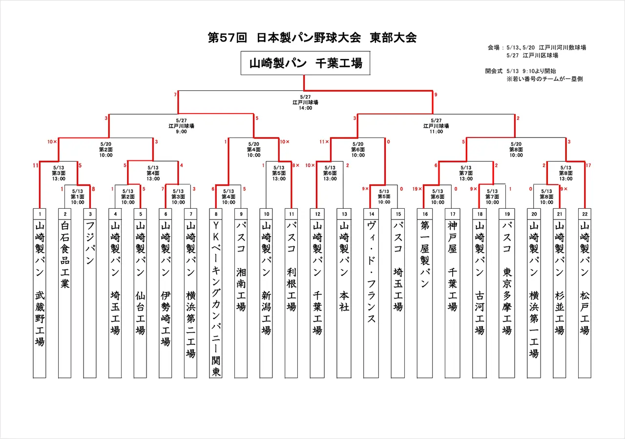 5月13日(火)に行われました第57回日本製パン野球大会東部大会初日の結果をお知らせします。