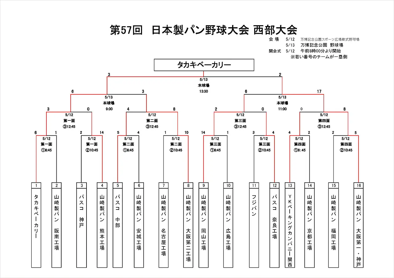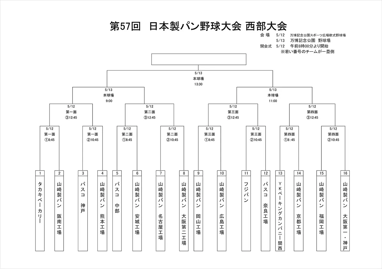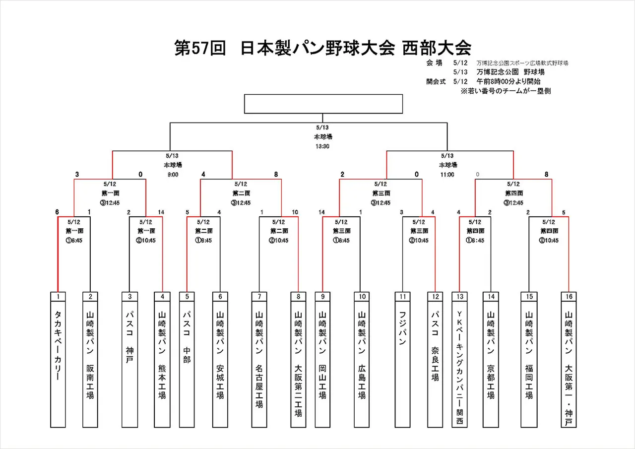 5月12日(月)に行われました第57回日本製パン野球大会 西部大会初日の結果をお知らせします。