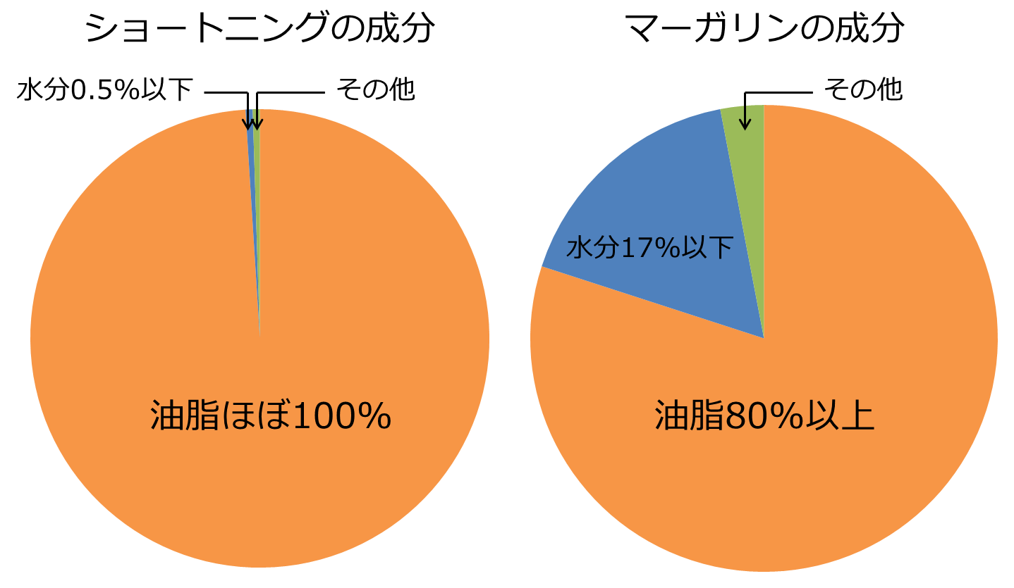 このように油脂と水分の比率がショートニングとマーガリンでは大きく異なります。
