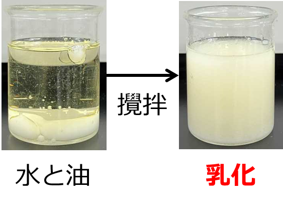 乳化とは本来混ざり合わないもの同士が、どちらか一方に分散し、均一な状態となっていることを言います。
