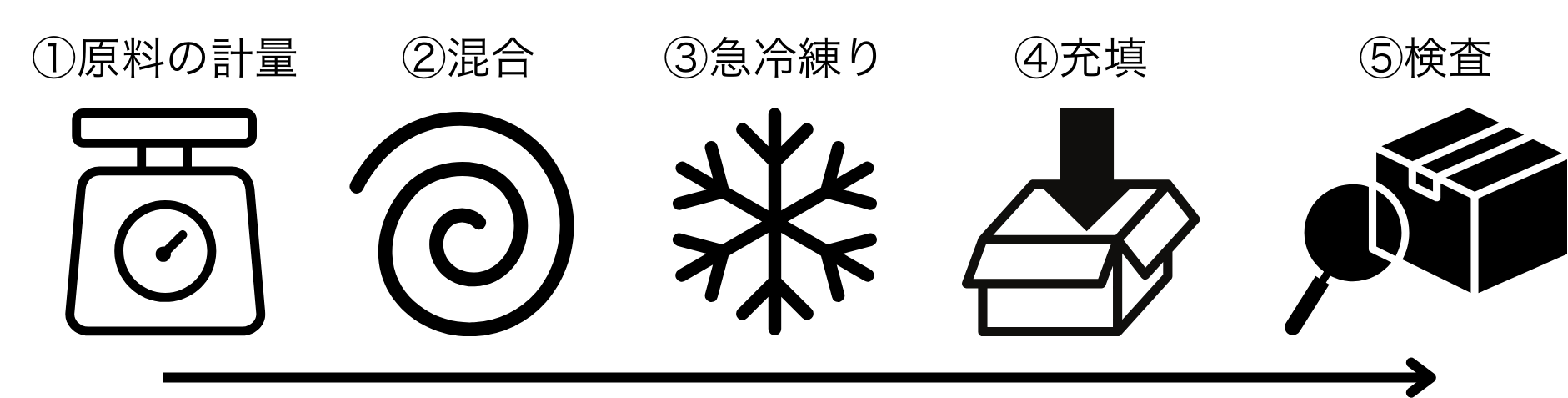 ①原料の計量、②混合、③急冷練り合わせ、④充填、⑤検査の大きく5つの工程からなります。