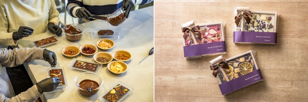参加者は、自分の好きなチョコレートや具材を選び、世界に一つだけのオリジナル「Knock on Chocolate」を作ることができるイベントです。「Knock on Chocolate」は、チョコレートを木槌で叩くことで、幸運や願いが叶う“Knock on wood”というおまじないに着想を得た、当店のギフト商品です。贈る相手の幸せや特別な瞬間を祝う特別なチョコレートを、ご自身の手で作ってみてはいかがでしょうか。