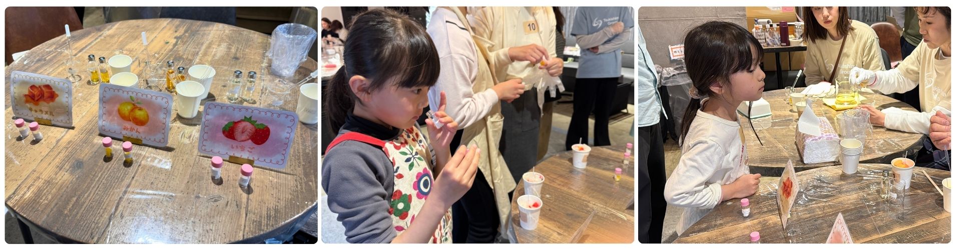 会場では、自由なデザインと好みの香りを選べるキャンドル作りを実施しました。あわせて、アップサイクルや環境への配慮について学ぶ時間を設けるとともに、グループ会社のサステナブルチョコレートや、普段目にする機会の少ない業務用チョコレートなどのおやつもお楽しみいただきました。