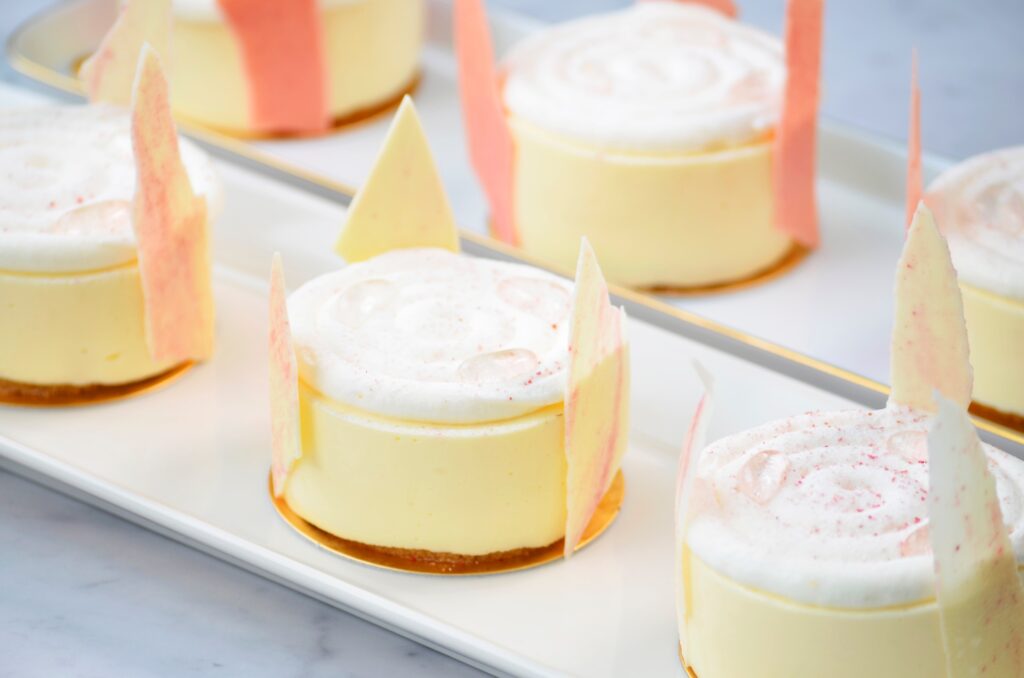 アールグレイ風味が豊かなビスキュイ生地の上に合わせるのは、軽くなめらかなムースフロマージュで、酸味の効いた果肉感のあるベリーのジュレを包み、シャンティーとホワイトチョコで華やかに飾りました。