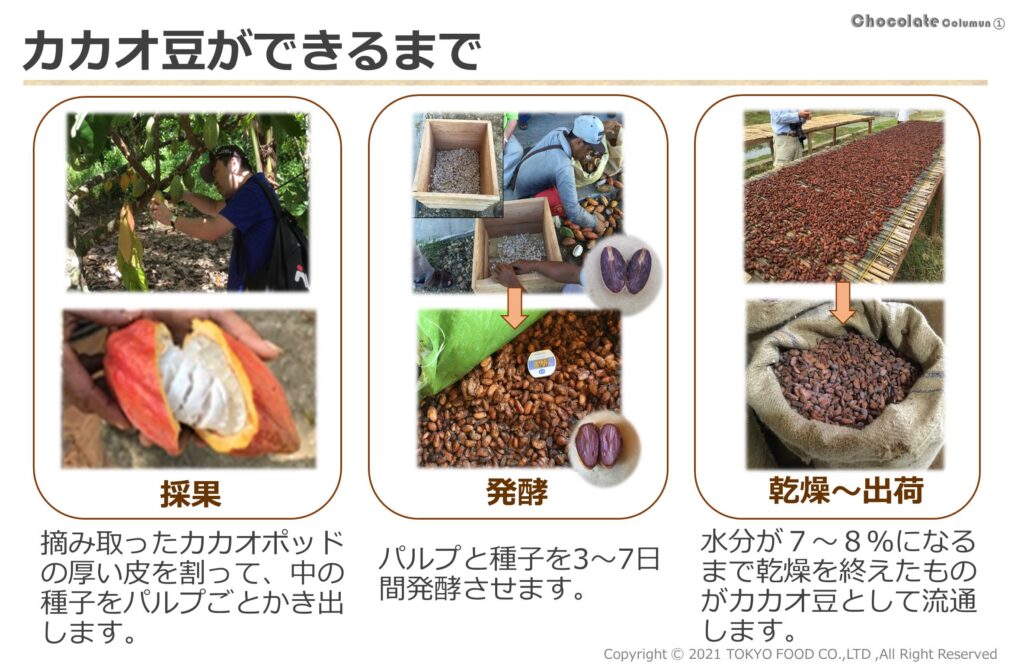 カカオの実を収穫した後、カカオ豆が出荷されるまではいくつかの工程が必要です。