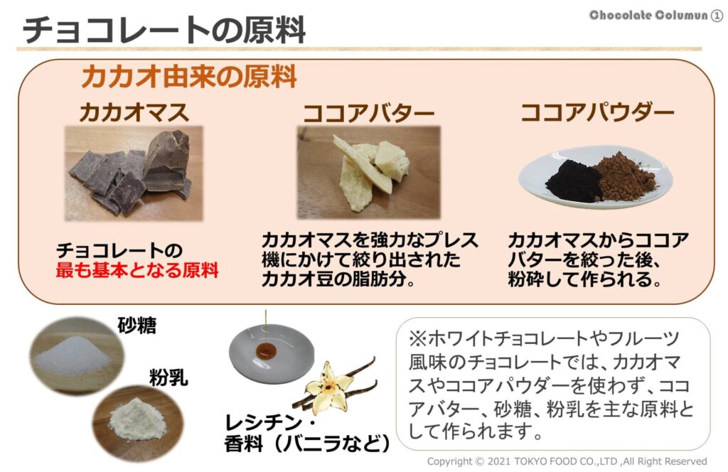 チョコレートの原料は、大まかに言うと「カカオマス」、「ココアパウダー」、「ココアバター」といった「カカオ」という植物に由来するものと、砂糖や粉乳などのそれ以外の原料に分かれます。