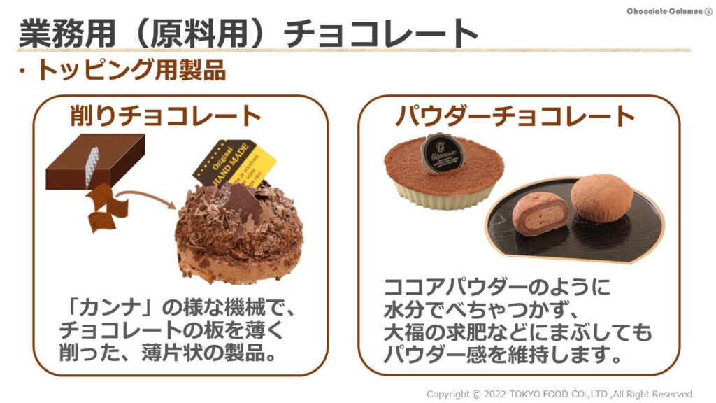 東京フードの削りチョコレート・パウダーチョコレートタイプ製品