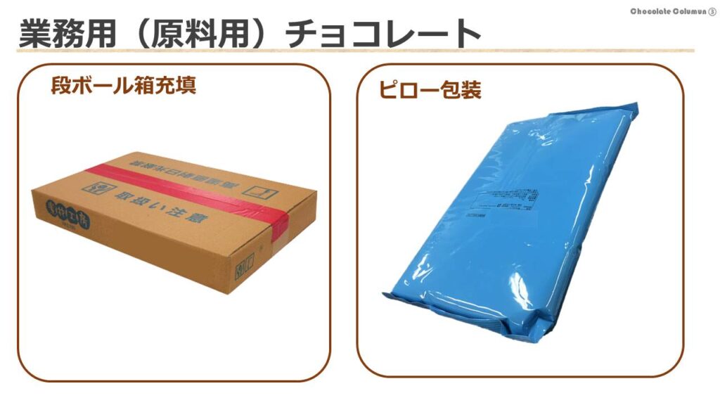 最も大きいものでは、5kgや10kgのブロック状に固められたタイプがあります。段ボール箱に入っているので、一見チョコレートとは思えないような外観です。コーティング用チョコレートなどはこのような形態になることが多いです。