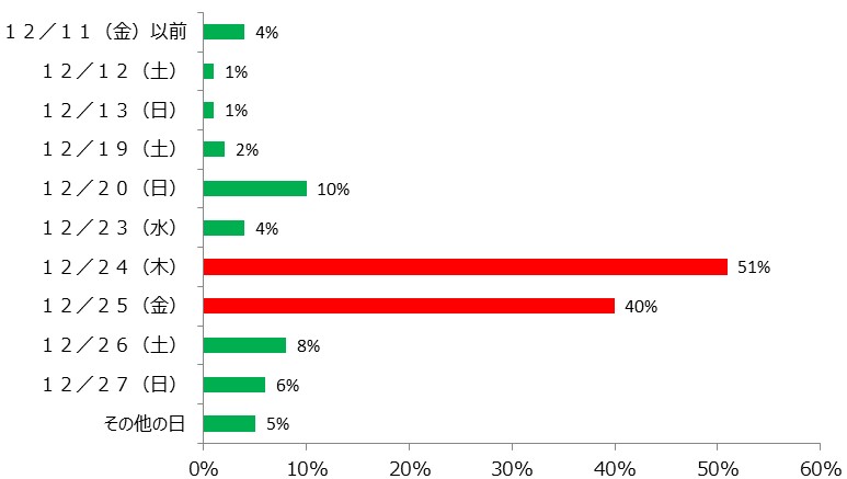平日クリスマスだった2020年、半数以上の方が12/24(木)のクリスマスイヴに食べたと回答して1番。