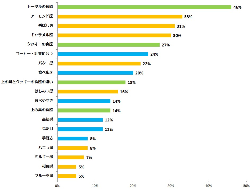 全体の46%の方が「トータルの食感」と最も多く、27%の方が「クッキーの食感」と回答。’食感’が大切なことがわかりました。