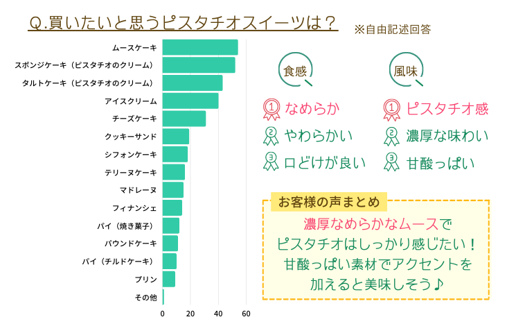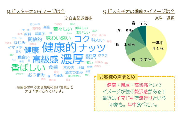 最近ではコンビニスイーツやアイスでもピスタチオ味の商品が話題になっているため、イマドキ・流行りというイメージを持っていることも窺えます。