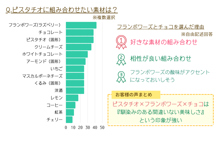 やはり、濃厚×甘酸っぱい風味が人気です。チョコレートやフランボワーズはピスタチオとの相性が良いというイメージもあり、馴染み深く間違いのない味だという印象が見られました。
