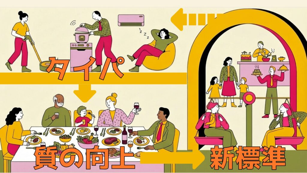 「タイパ」で生まれる時間的な余裕を、「質の向上」した商品やサービス体験に充てることで、それが次世代の「新標準(新しい当たり前)」とつながっていきます。