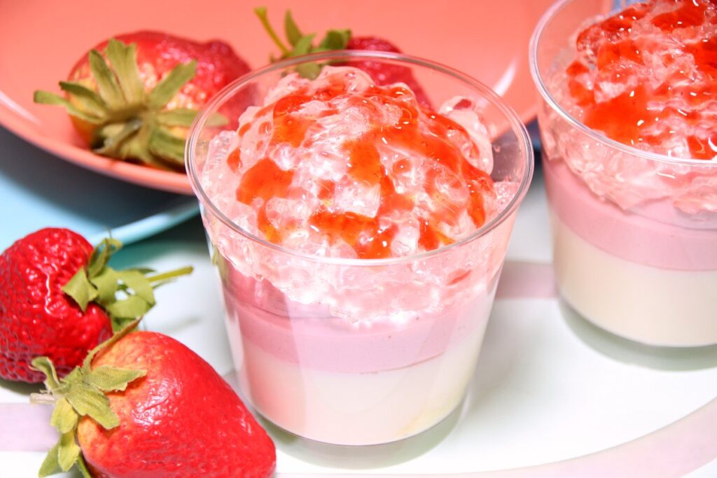 かき氷風のデザインが涼しい見た目のカップデザートです。ムースに『こだわりたまごのカスタード』をアングレーズとして使用したお手軽レシピです。