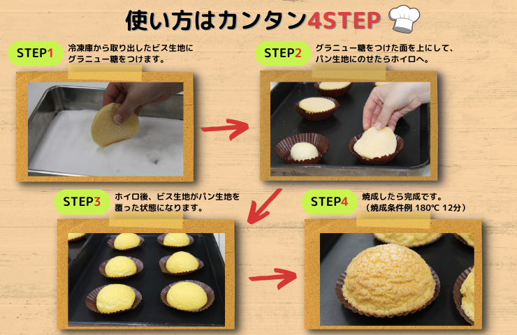 3. ビス生地をパン生地の上にのせて焼くだけで、熟練した技術が必要なリッチタイプのメロンパンを簡単に作ることができます。