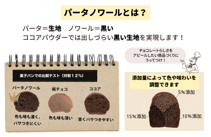 練り込みやすいペースト状でココアパウダーのように飛散することなく作業環境が綺麗に保てます。ココアパウダーに比べ、しっとりとした食感に仕上がります。