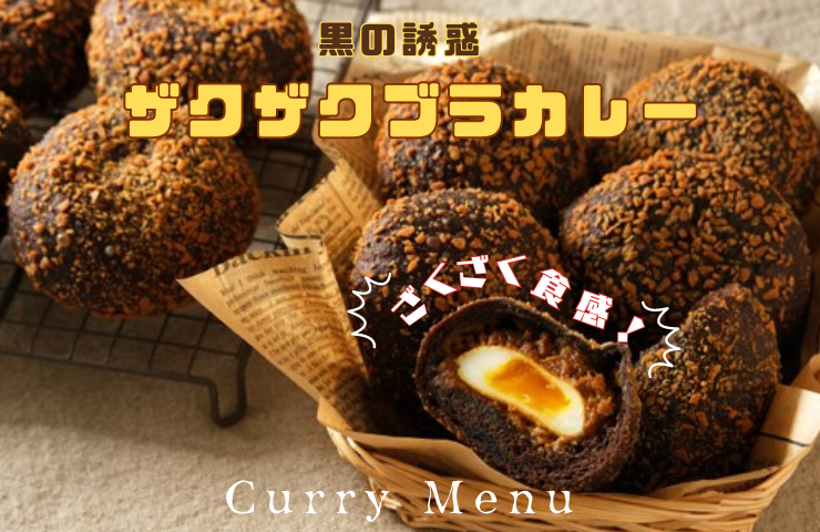 ザクザク食感のクラッカーをまとった真っ黒な生地にとろりと溢れ出す卵とカレーを閉じ込めた個性的カレーパン。見た目も食感もインパクト抜群で、食べたらやみつき!みんなの心をぎゅぎゅぎゅっと鷲掴みにします。