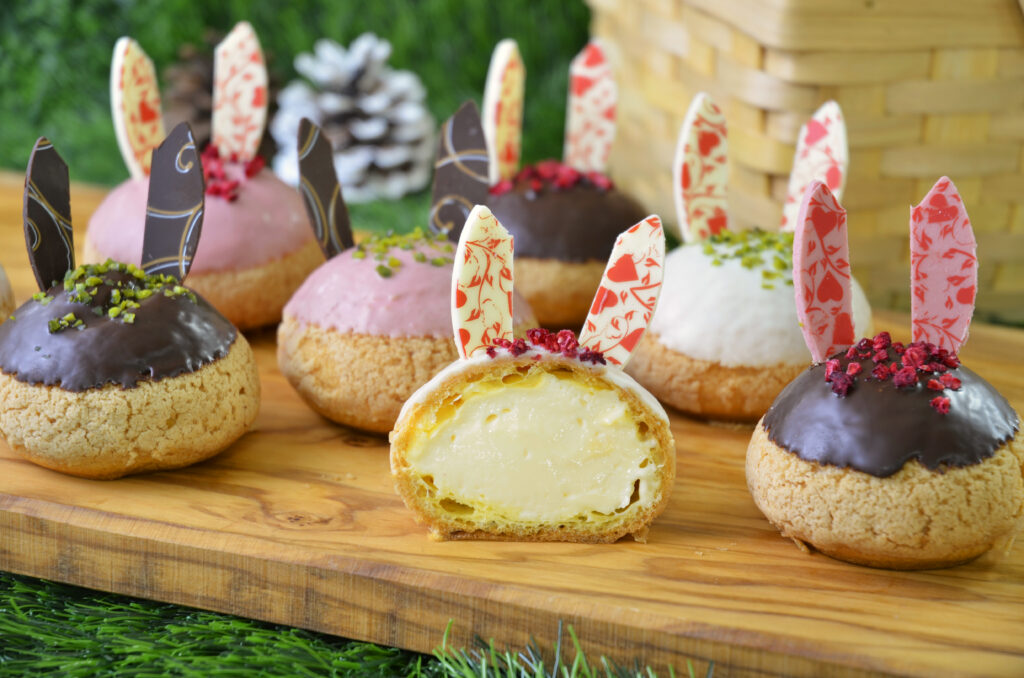 卵のおいしさが詰まったカスタードクリームをたっぷり注入し、チョコレートと耳でおめかしをしたかわいらしいウサギのクッキーシューです。