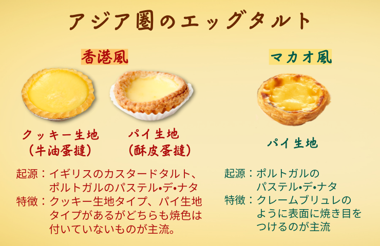 生地はパイ生地が主流で、こちらはバターを使います。香港風はなめらかで光沢のある見た目ですが、マカオ風はポルトガルのパステル・デ・ナダを色濃く受け継ぐクレームブリュレのような焼き色が特長です。香港風のエッグタルトへポルトガル式のパステル・デ・ナタの要素が調和され、アジア圏に広く広まったと言われています。
