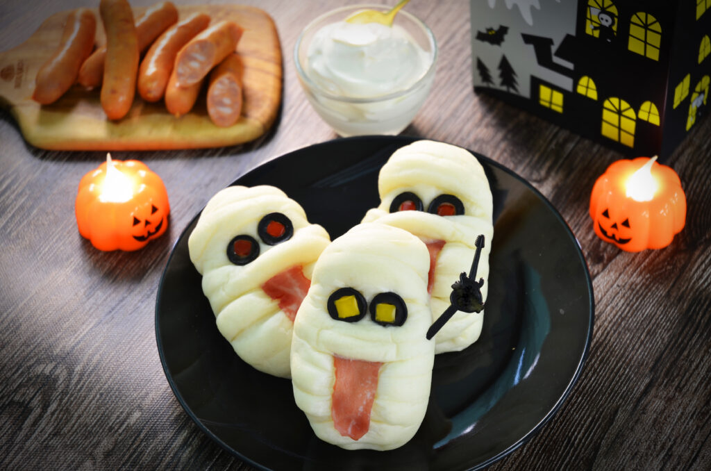しっとり食感のパン生地でソーセージとなめらかなチーズフォンデュフィリングを包み、包帯のように細くカットした生地を巻き付けると…。まるで舌を出したミイラが踊り出すようなユニークな惣菜パンに♪赤い目のミイラにはチョリソーを、黄色い目のミイラにはソーセージを使用した2種をご用意。大人も子供も一緒に楽しめるハロウィンパンです。