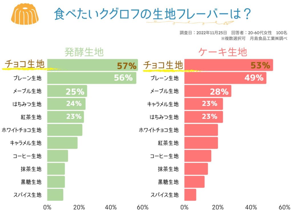 クグロフは本来、パンのような発酵生地タイプですが、近年ケーキ生地タイプも市場に増えてきています。今回は生地別に食べたいフレーバーを聞きました。(複数回答可)