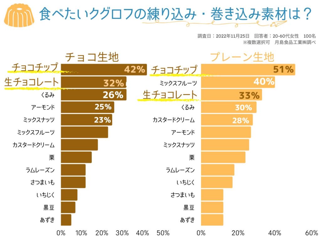 人気の高かったチョコ生地、プレーン生地のクグロフに、それぞれどのような練り込み・巻き込み素材を使用したいか聞きました。(複数回答可)