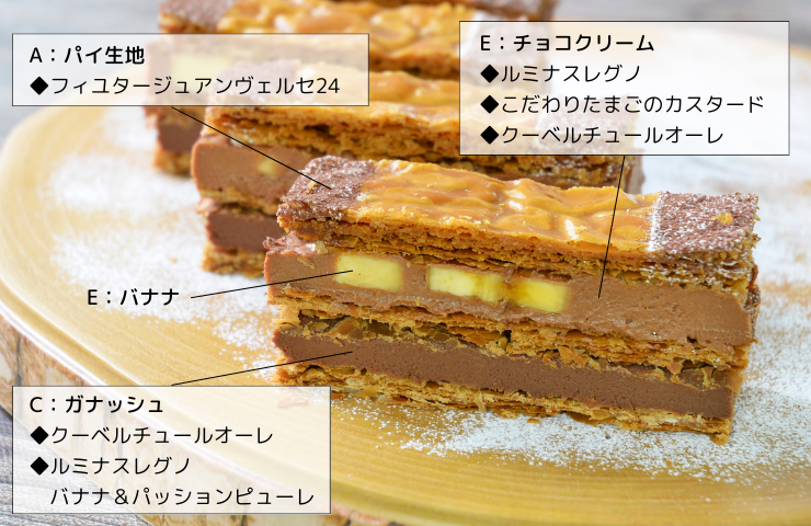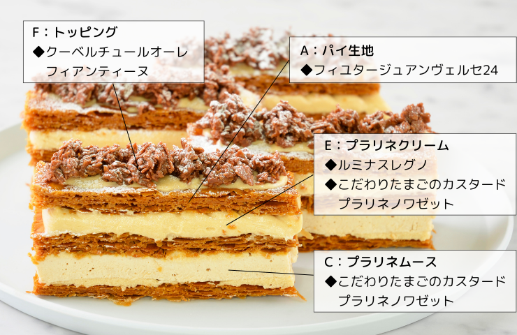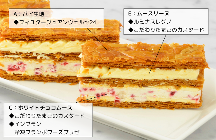 今回使用している「フィユタージュアンヴェルセ24」は、「アンヴェルセ製法」という伝統製法で作り上げているため、サックサクの繊細な食感を存分にお楽しみいただけます。