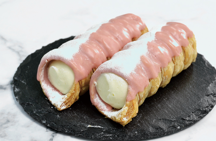 サクサクのパイにチーズクリームとあまおう苺の甘酸っぱい美味しさが広がるパイコロネです。簡単4ステップで完成するパイコロネを、定番人気のチーズと苺の組み合わせで仕立てました。ピンク色に染まった可愛らしいスイーツでショーケースを彩りませんか?