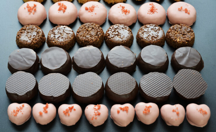 冷凍クランブル生地『クランブルクラシック』とあまおう苺のコーティング『レーベルストロベリーキューブ』を組み合わせたお手軽クランチチョコです。見た目にも可愛らしいピンク色の苺チョコレートとホワイトチョコの相性抜群な組み合わせで仕立てました。型を変えてバラエティ豊かに展開可能です。