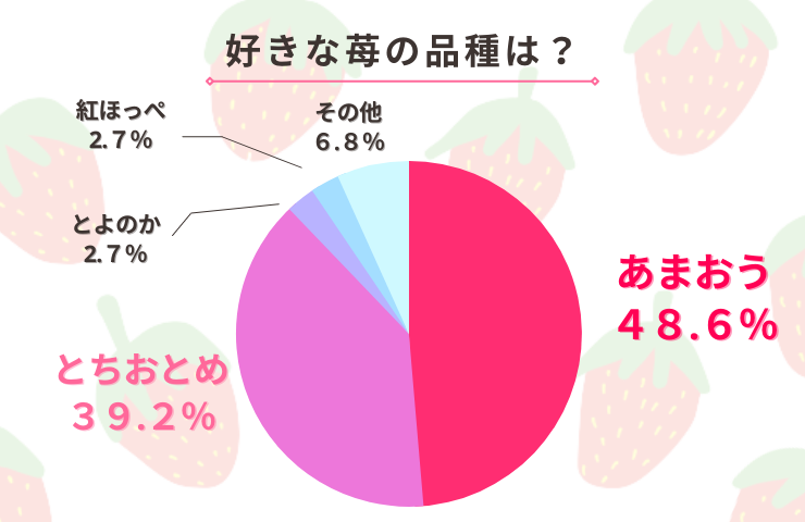 福岡のブランド苺「あまおう」が半数近い票を集め1位となりました。甘さと酸味のバランスが良い「あまおう」の全国的な人気がうかがえます。その他には、越後姫、乙女、などの回答がありました。