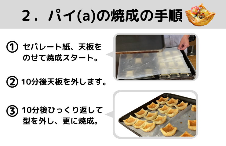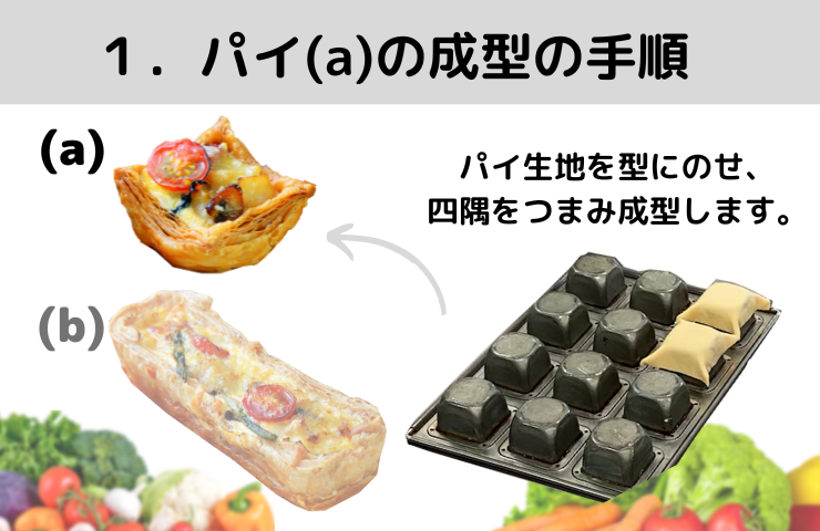 - 焼成冷却後のパイ生地に、具材を(a)20g、(b)50gのせます。